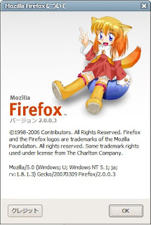 萌え画像が好きらしいというナニ情報もあるけれど、まあいまやマネキンにまで萌えテイストを加える時代だから別にどうってことない。オジサンもむかし萌え画像系更新サイトをチェックしていた時期があると告白したからといって、多分コミュニケーションが深まるというものでもないだろう。だって今はもう興味を失ってそんなことは止めてしまったわけだし、「昔はオレもね」的な年寄りの語りくらいむしろ鬱陶しいものはない。今ではたまにFirefoxの 「Mozilla Firefoxについて」ダイアログをいじってみたりすることがあるだけだ。