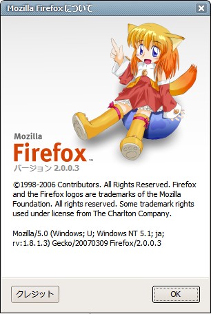 萌え画像が好きらしいというナニ情報もあるけれど、まあいまやマネキンにまで萌えテイストを加える時代だから別にどうってことない。オジサンもむかし萌え画像系更新サイトをチェックしていた時期があると告白したからといって、多分コミュニケーションが深まるというものでもないだろう。だって今はもう興味を失ってそんなことは止めてしまったわけだし、「昔はオレもね」的な年寄りの語りくらいむしろ鬱陶しいものはない。今ではたまにFirefoxの 「Mozilla Firefoxについて」ダイアログをいじってみたりすることがあるだけだ。