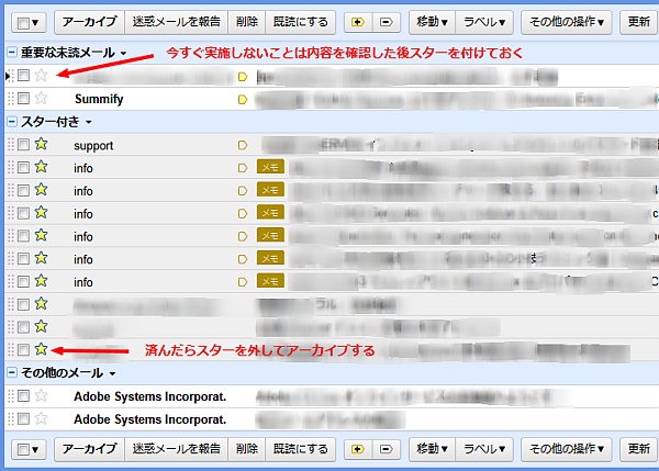 また、手が空きしだい順次処理していくべきものは、スターを付けずにそのまま「重要な未読メール」のエリアに残しておき、処理したら、アーカイブする。